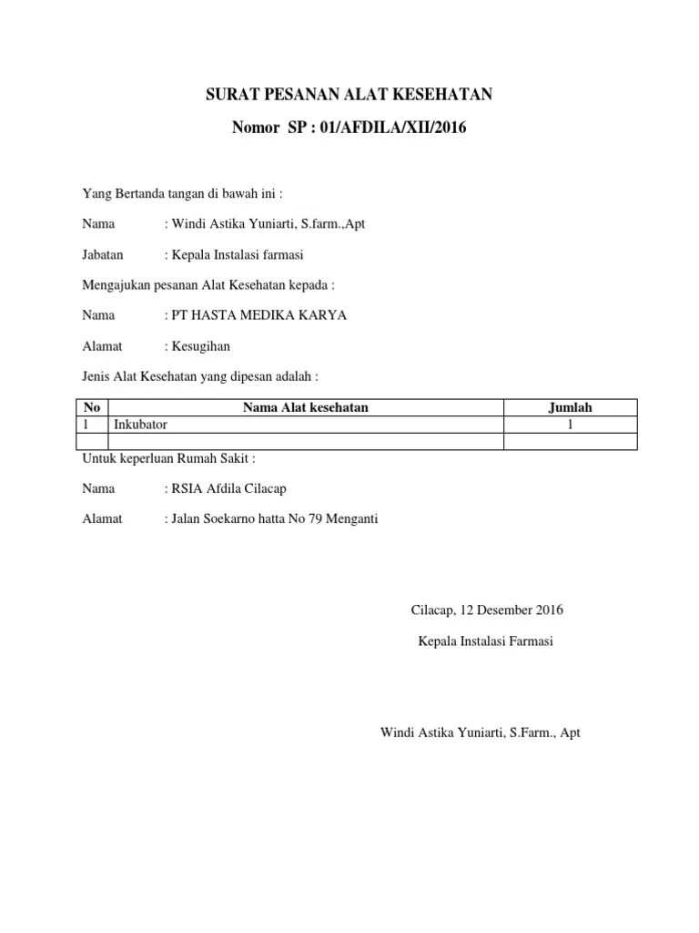 Conto Surat Pesanan Alat Kesehatan / Menindaklanjuti surat penawaran anda, tanggal 15 april 2018, perihal alat perlengkapan belajar.. Untuk memesan suatu barang dari seorang calon pembeli kepada penjualnya, baik itu bisa perorangan maupun kelompok atau . Windi astika yuniarti, s.farm.,apt · jabatan : Asli dan fotocopy daftar terperinci alat perlengkapan apotek Demikian surat pesanan barang ini kami sampaikan. 01/afdila/xii/2016yang bertanda tangan di bawah ini :